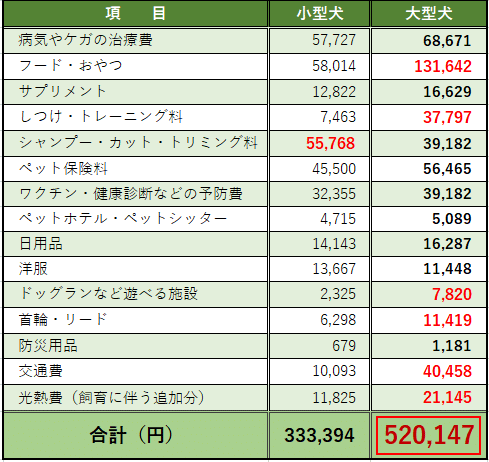 この調査では、犬の大きさ別に年間の支出を調べていますので、参考までにご覧下さい。